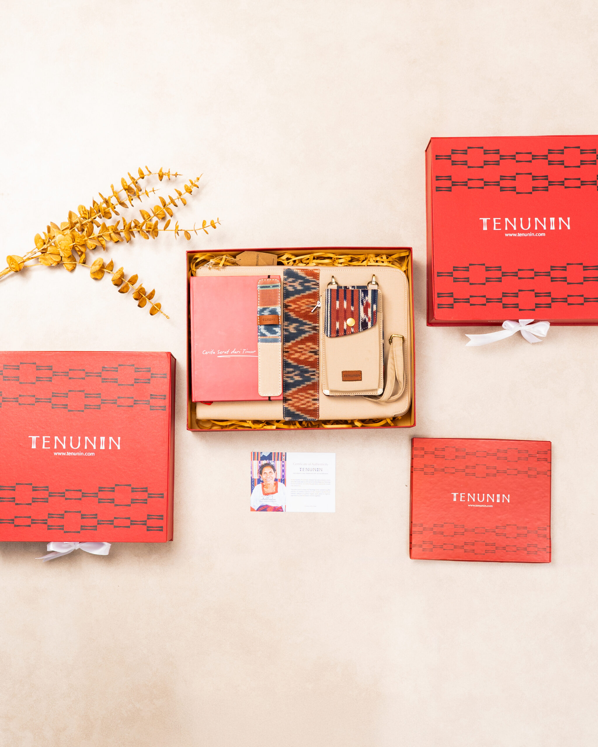 Kemasan hadir sebagai gift box Tenunin berwarna merah dengan motif geometrik khas, ditata rapi menggunakan paper filler, dilengkapi pita putih dan kartu autentikasi yang menarasikan kisah perajin—menghadirkan pengalaman unboxing yang hangat, profesional, dan berkesan.