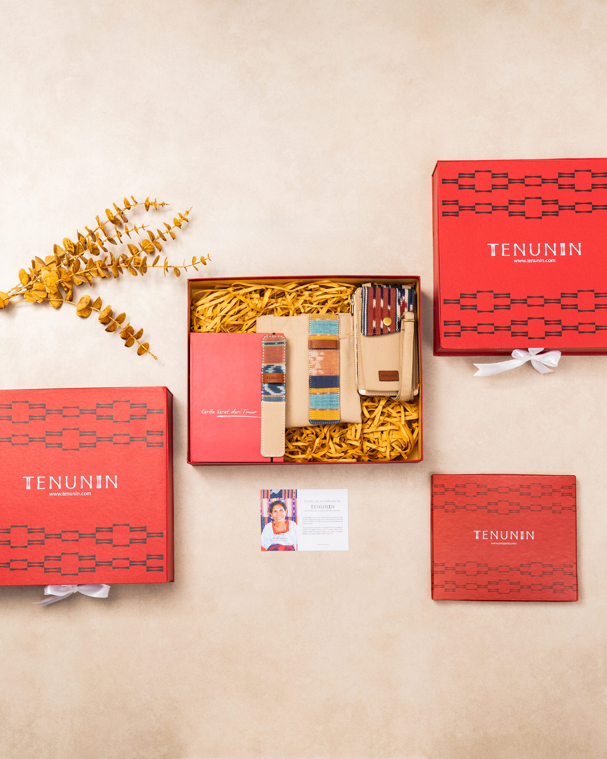 Semua dikemas gift-ready di box Tenunin berwarna merah dengan motif geometrik khas, ditata rapi memakai paper filler, dilengkapi pita putih dan kartu autentikasi perajin—menciptakan pengalaman unboxing yang hangat, profesional, dan berkesan.